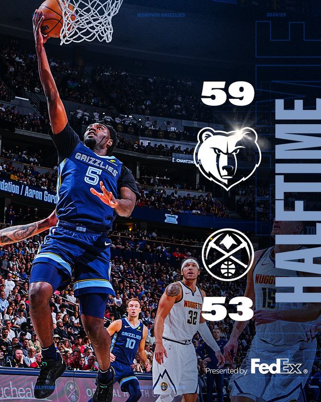 灰熊队的贝恩上半场得到14分,莫兰特得到12分和3次助攻;掘金队的戈登得到13分,约基奇得到7分和7个篮板。